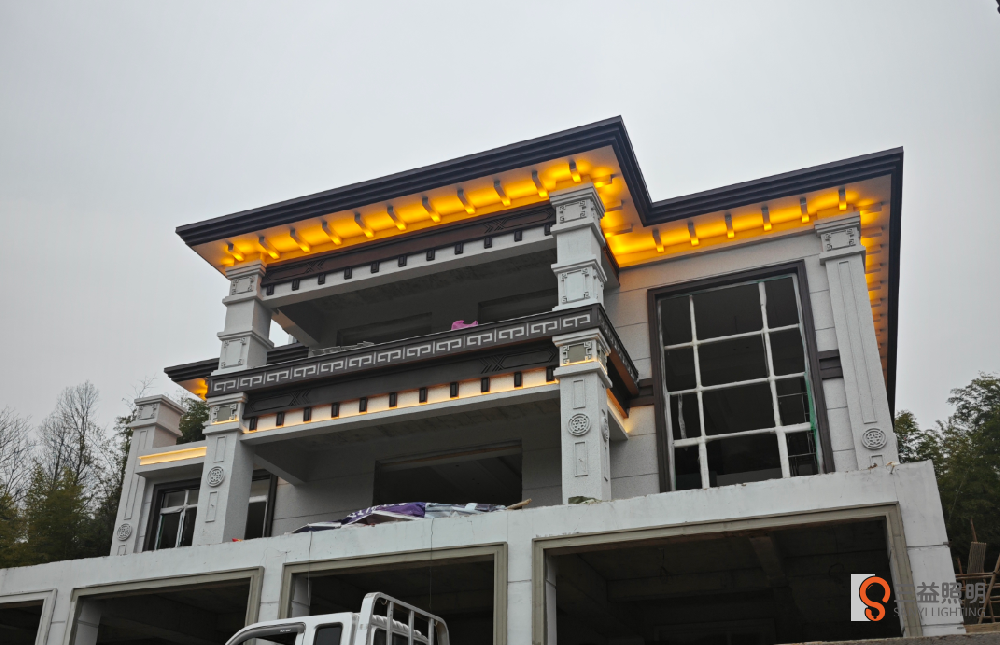 大福劉府是三層新中式別墅,外墻使用藝術仿石漆,搭配暖白色燈光,效果溫馨又豪氣。